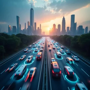Ocean:glowing golden sunrise light Sustainable Fishing with AI restoring oceanic equilibrium